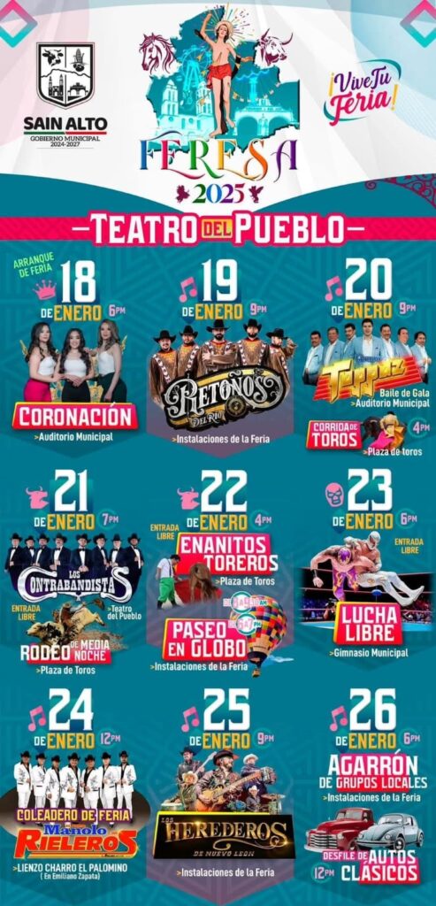 El programa artístico del Teatro del pueblo inicia con la presentación de Los Retoños del Río este 19 de enero; hoy 2o de enero se llevará a cabo una corrida de toros y por la noche, en el auditorio municipal se presenta el grupo Toppaz en un baile de gala.