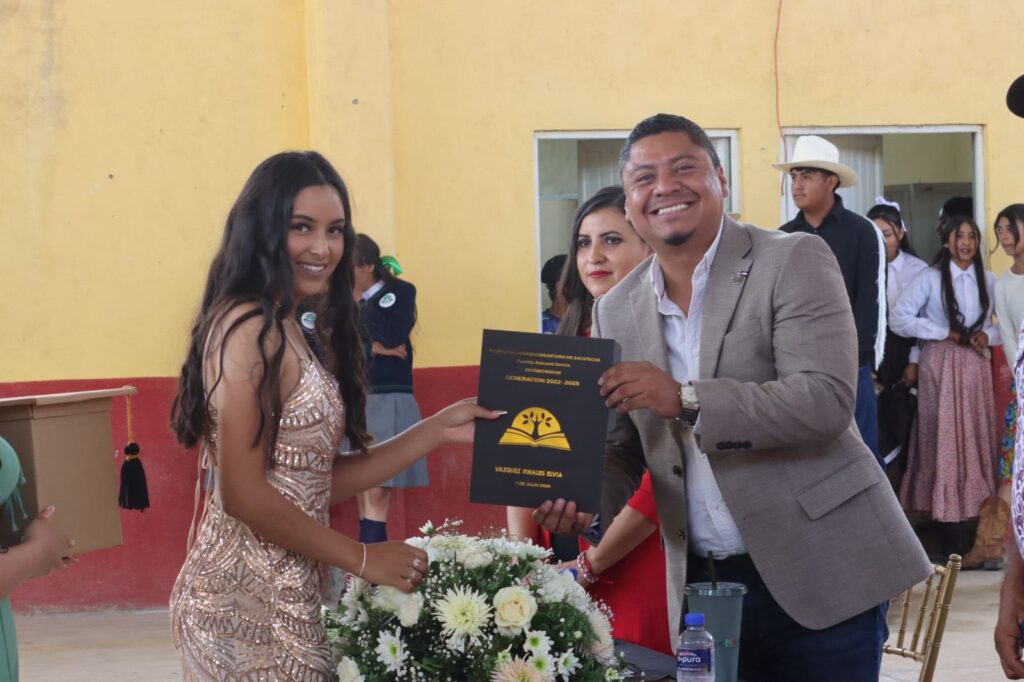 VILLA DE COS, ZAC.- Estudiantes del Telebachillerato Comunitario de Emiliano Zapata culminaron sus estudios y el presidente municipal Pier Michel Ríos Ruiz los acompañó.