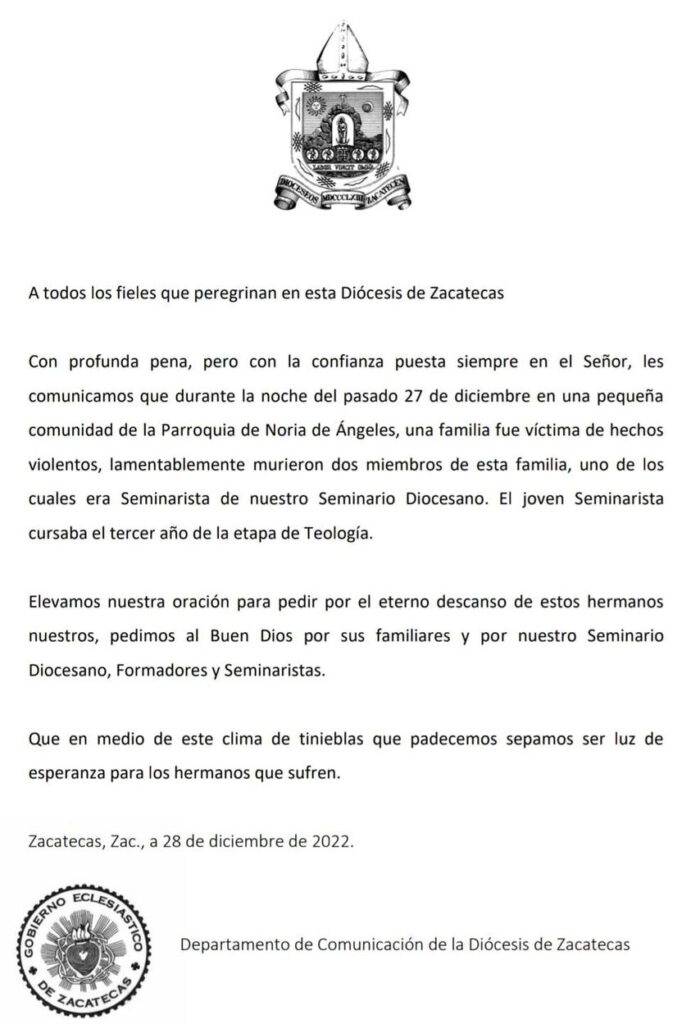 En el documento manifestaron «que durante la noche del pasado 27 de diciembre en una pequeña comunidad de la Parroquia de Noria de Ángeles, una familia fue víctima de hechos violentos, lamentablemente murieron dos miembros de esta familia, uno de los cuales era Seminarista de nuestro Seminario Diocesano. El joven Seminarista cursaba el tercer año de la etapa de Teología».