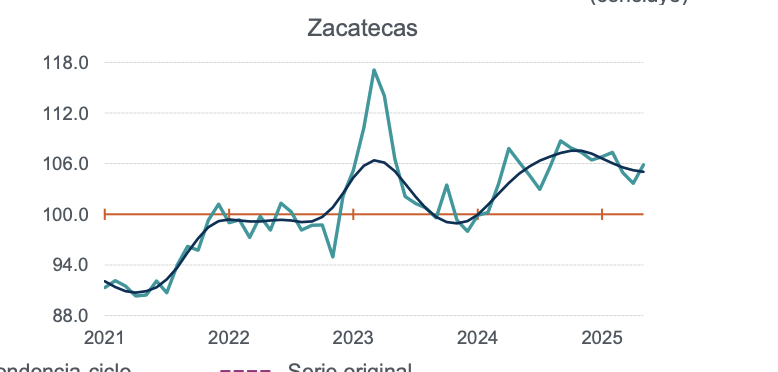 ZACATECAS, ZAC.- En mayo de 2025, de la actividad industrial en Zacatecas, sólo el sector de la construcción reportó aumento positivo, pues el de minería, industrias manufactureras y de generación y transmisión reportaron saldos negativos.