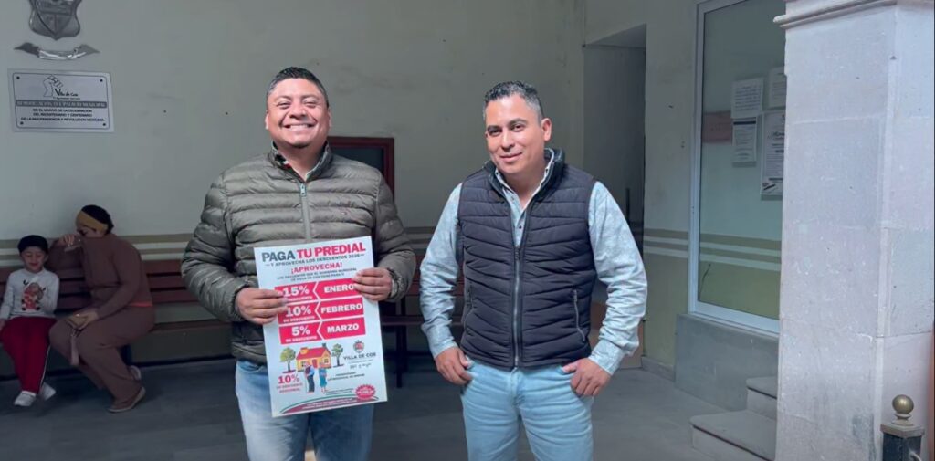 VILLA DE COS, ZAC. – El alcalde Pier Michel Ríos Ruiz llamó a la ciudadanía para sumarse a la campaña de recaudación del impuesto predial 2026, la cual inició este mes con una serie de incentivos económicos y beneficios para los contribuyentes cumplidos. El mandatario destacó que estos recursos son la base para dar continuidad a proyectos de bacheo, servicios de recolección de basura y diversas obras públicas que demandan las familias del municipio.
