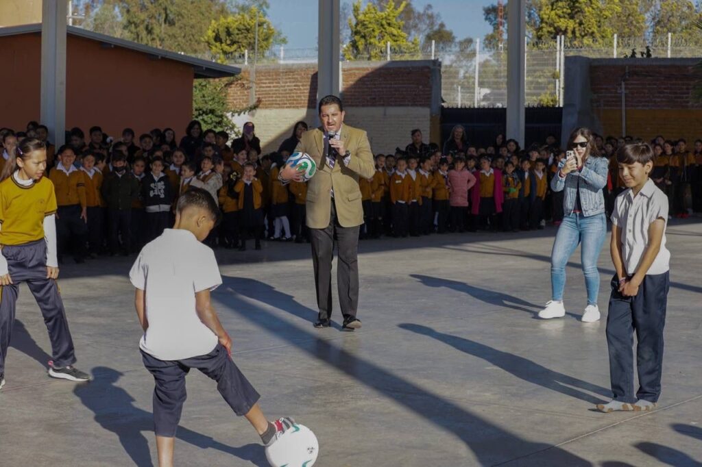 Como parte del programa de motivación, Torres Rodríguez realizó una dinámica con los alumnos, a quienes hizo entrega de balones conmemorativos del mundial.