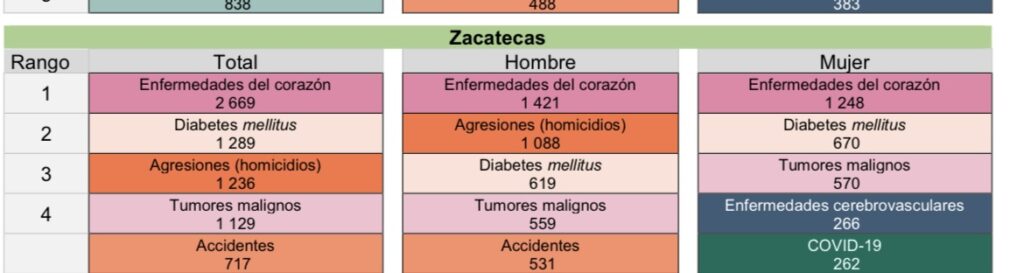 En el caso de Zacatecas, la tasa de defunciones registradas por cada 100 mil habitantes fue de 744, lo que posiciona a la entidad en el sexto puesto a nivel nacional en este rubro.