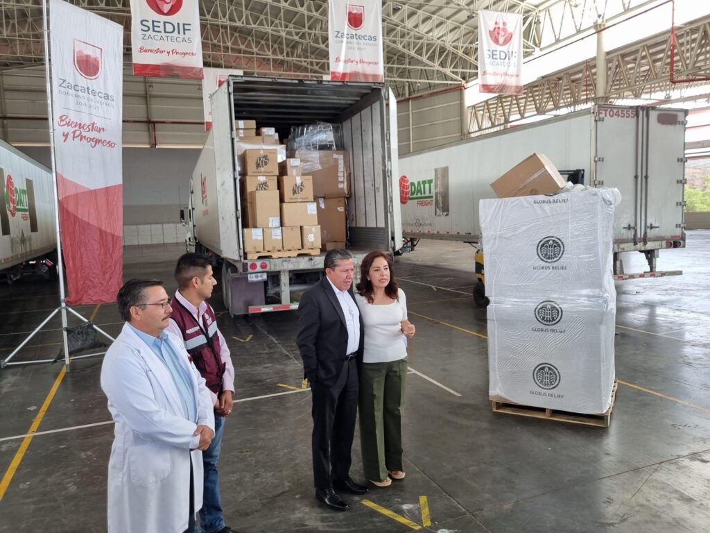 Este jueves arribaron a Zacatecas cuatro tráileres con equipo y material médico derivado de la gestión ante la Fundación Mexicanos Unidos en Utah y la asociación Globus Relief.