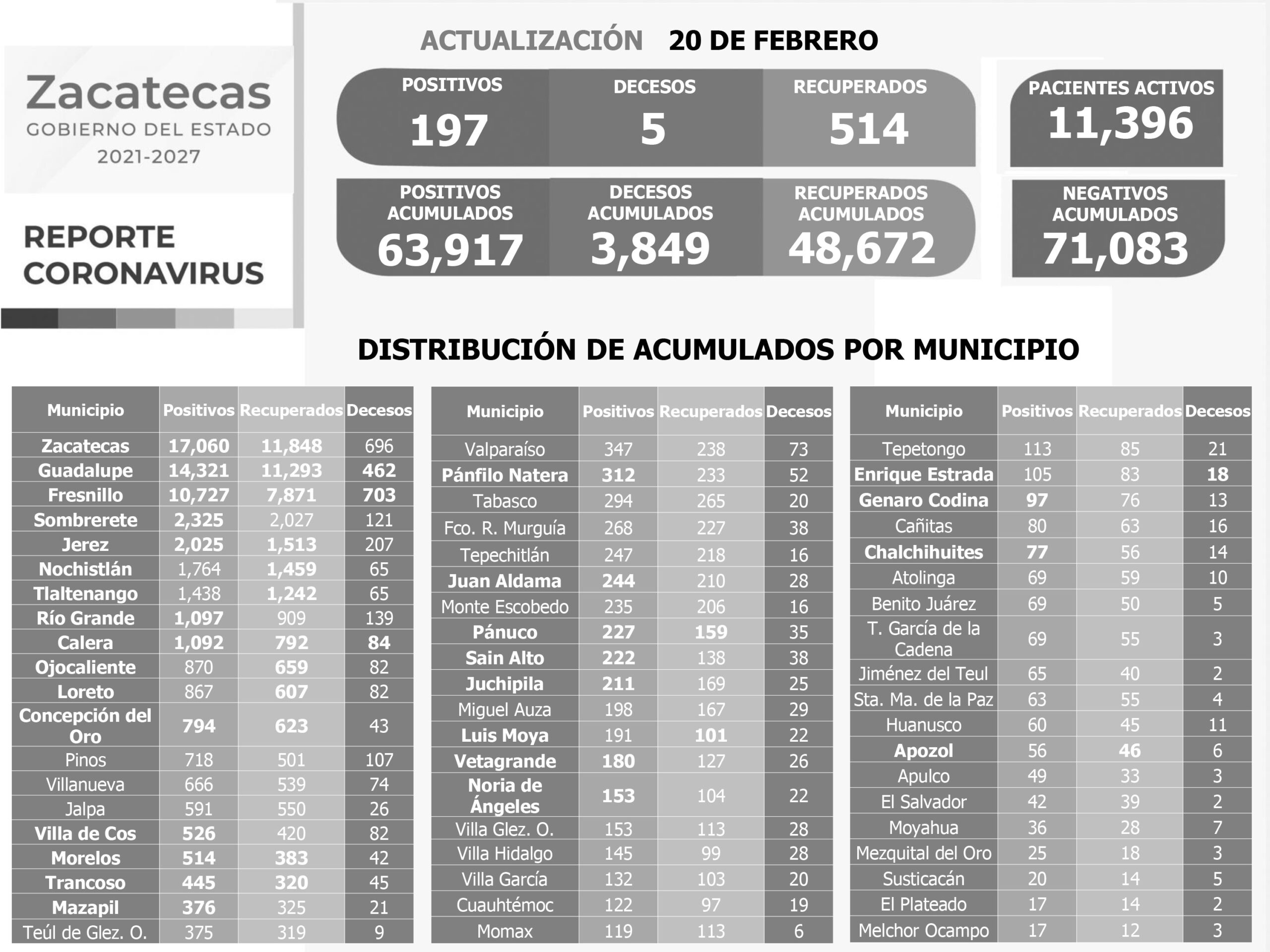 En Guadalupe se presentaron 104 contagios y en Sombrerete 38; fueron los más significativos. El resto ocurrió en Calera, Concepción del Oro, Chalchihuites, Genaro Codina, Fresnillo, Jiménez del Teúl, Loreto, Mazapil, Ojocaliente, Trancoso, Valparaíso, Vetagrande, Villanueva y Zacatecas.