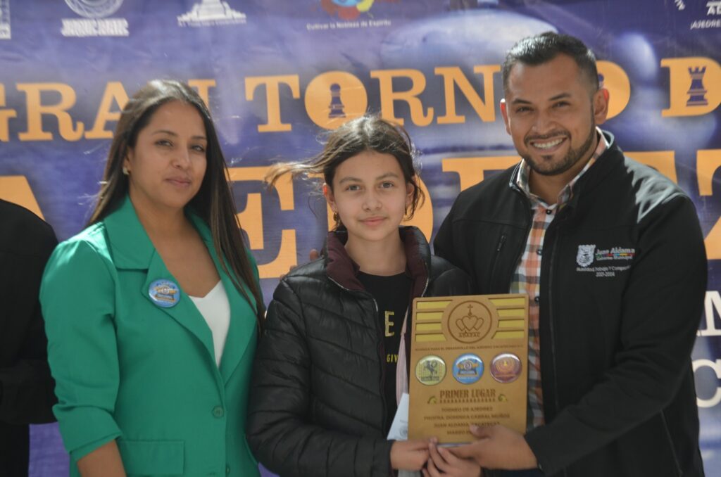 JUAN ALDAMA, ZAC.- Hassan Garduño, presidente municipal, entregó premios y reconocimientos a los ganadores del Primer Torneo de Ajedrez Maestra Dominga Cabral, en la escuela primaria del mismo nombre.