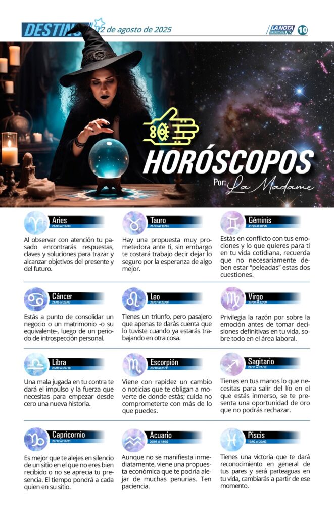 Destino Horóscopos de la Madame Ago-12-2025 ¿Viajarás? ¿Encontrará ese trabajo que deseas? ¿Se te declarará? ¿Irás de fiesta? Descubre lo que te depara el destino con los Horóscopos de la Madame. 🔮✨