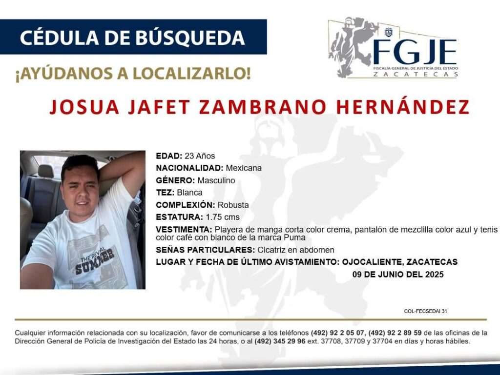 Joshua Zambrano Hernández, hijo del alcalde de Ojocaliente, fue reportado como no localizado el 9 de junio de 2025.