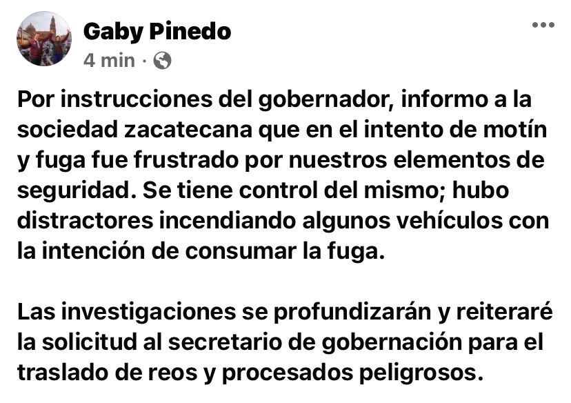 Y, aunque las autoridades sólo confirmaron un motín, así como la participación de las fuerzas del orden en ese centro penitenciario, de manera simultánea se reportaron estrellas ponchallantas en las carreteras y diversos hechos delictivos cómo narcobloqueos en Ciudad Cuauhtémoc, Fresnillo, Río Grande y Enrique Estrada.