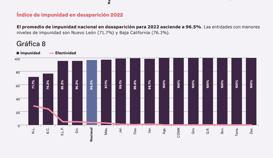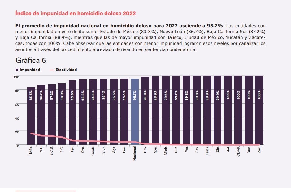En este sentido, Zacatecas, al igual que Jalisco, Ciudad de México y Yucatán, presentó en 2022 un índice de impunidad en el delito de homicidio doloso de un 100 por ciento.