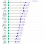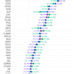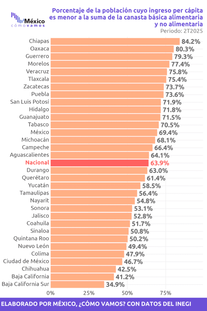 El semáforo económico estatal de pobreza laboral se encuentra en verde en 16 entidades, ya que tienen niveles de pobreza más bajos al nacional (35.1%) y su cambio en el porcentaje de la población en esta situación tuvo mejor desempeño que el nacional, o bien, cumplen directamente con la meta de presentar un nivel menor al 20.5%.Al segundo trimestre de 2025, nueve entidades federativas mostraron un incremento en su porcentaje de población en situación de pobreza laboral respecto al 2T2024: Jalisco, Nayarit, Campeche, Estado de México, San Luis Potosí, Veracruz, Morelos, Guerrero y Oaxaca.