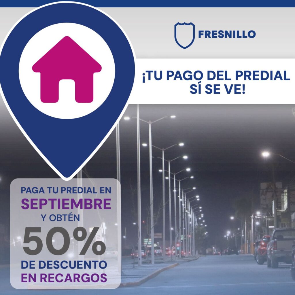 FRESNILLO, ZAC.- El gobierno municipal extiende, durante todo septiembre, el programa de regularización en el que se descuenta el 50% del total de los recargos a los contribuyentes, con el objetivo de apoyar a la ciudadanía a ponerse al corriente con el pago del impuesto predial.