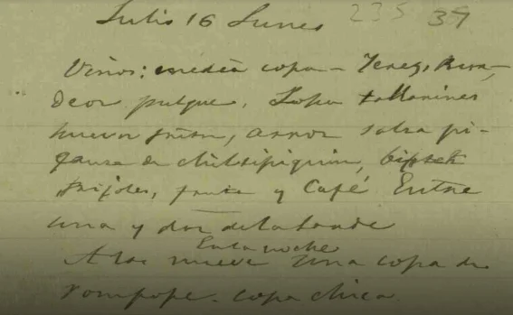 Media copa de jerez, sopa de tallarines, «salsa picosa de chiltepiquín», un café, servido entre la una y dos de la tarde, es el menú de la comida que pidió. Para más noche, solicitó media copa de rompope, que debía ser servida a las 9 hrs.