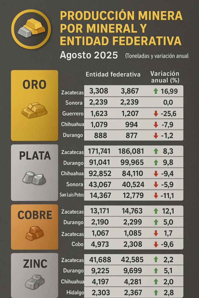 A nivel nacional, el INEGI informó que los minerales con mayor crecimiento fueron el azufre (+55.2 %), el plomo (+15.7 %) y el oro (+11.3 %). En contraste, el cobre (-7.9 %), el zinc (-13.0 %) y los pellets de fierro (-19.3 %) mostraron caídas significativas.