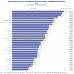 Entre 2022 y 2024, la carencia por acceso a la seguridad social se redujo en 28 entidades federativas. Los tres estados con mayores disminuciones fueron Querétaro (de 43.2 a 37.4 %), Guanajuato (de 50.2 a 46.0 %) y Zacatecas (de 57.0 a 52.9 %). En contraste, San Luis Potosí (de 48.2 a 51.2 %), Colima (de 35.9 a 37.3 %) y Guerrero (de 71.6 a 72.6 %) fueron las entidades que presentaron un mayor aumento en dicha carencia.