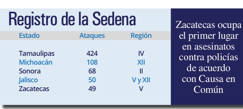 De acuerdo con Causa en común, en Zacatecas, hasta el 29 de septiembre, 46 policías habían sido asesinados, le siguen Guanajuato con 42, Guerrero, con 23, Veracruz con 22 y Michoacán con 22.