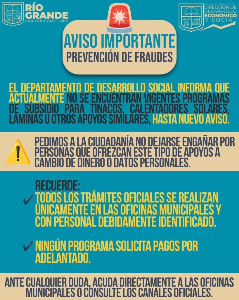 RÍO GRANDE, ZAC.- El Departamento de Desarrollo Social del Gobierno Municipal de Río Grande emitió un aviso urgente a la población para prevenir fraudes relacionados con la entrega de apoyos subsidiados. Las autoridades locales aclararon que, por el momento, no existen programas vigentes para la adquisición de tinacos, calentadores solares o láminas.