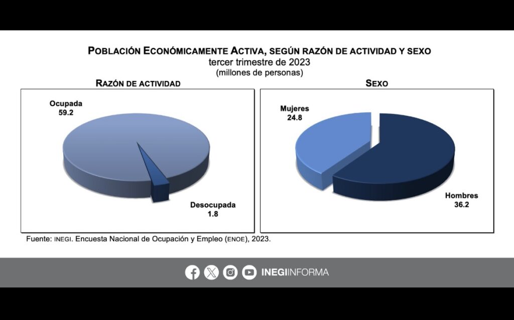 A nivel nacional, la Población Económica Activa (PEA) del país fue de 61 millones de personas, 1.5 millones más que en el tercer trimestre de 2022. La PEA representó 60.6 % de la población de 15 años y más.
