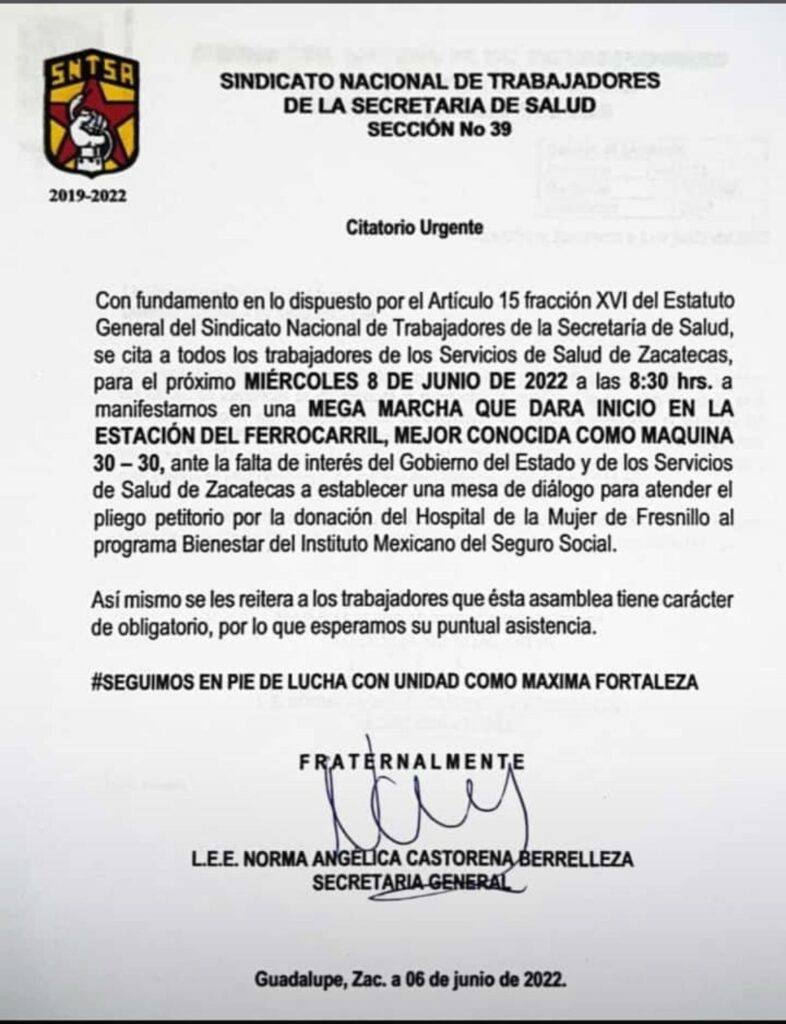 Mediante un citatorio urgente, el Sindicato Nacional de Trabajadores de la Secretaría de Salud (Sntsa), sección 39, con fundamento en los dispuesto por el Artículo 15, fracción XVI, del estatuto general del Sntsa, citó a los trabajadores de Salud con carácter de obligatorio.