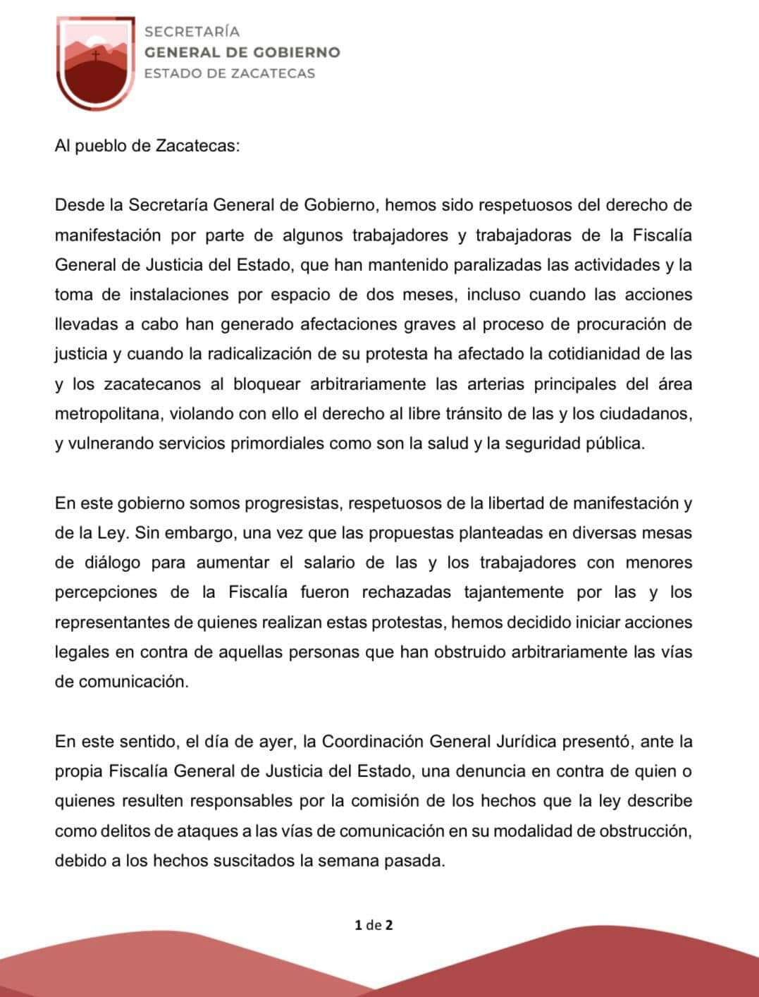 En el documento emitido por la Secretaría General de Gobierno se asegura que estas acciones «han generado afectaciones graves al proceso de procuración de justicia y cuando la radicalización de su protesta ha afectado la cotidianidad de las y los zacatecanos al bloquear arbitrariamente las arterias principales del área metropolitana, violando con ello el derecho al libre tránsito de las y los ciudadanos, y vulnerando servicios primordiales como son la salud y la seguridad pública».