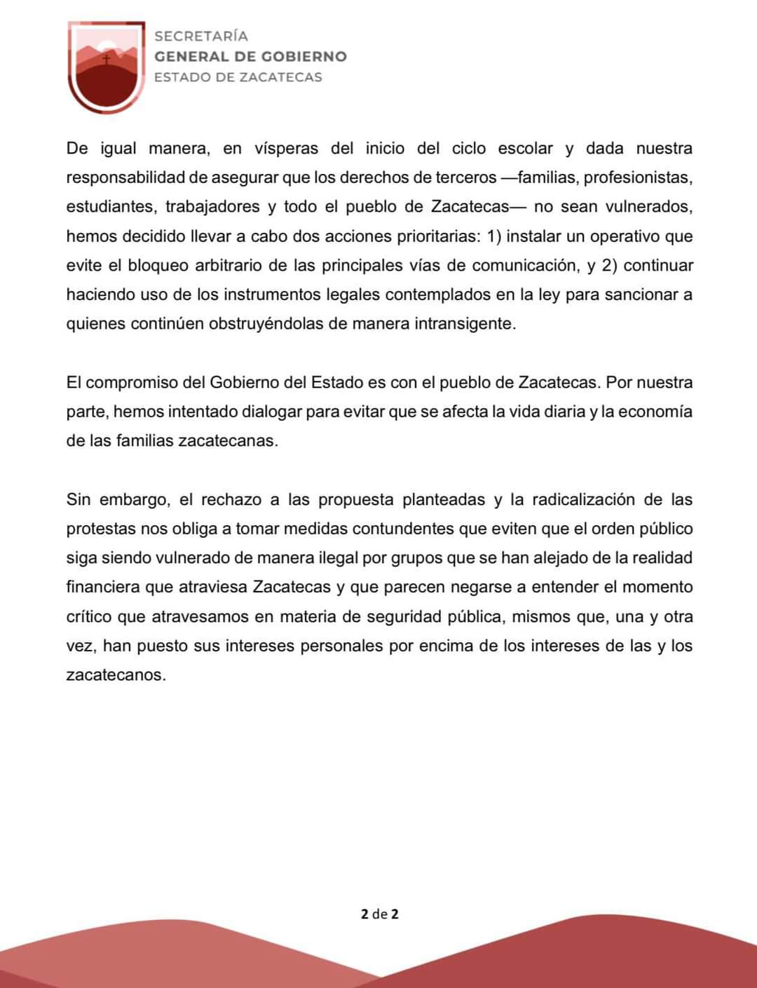 También se manifestó en el documento que el Gobierno del Estado «ha intentado dialogar para evitar que se afecte la vida diaria y la economía de las familias zacatecanas», además de que quieren evitar «que el orden público siga siendo vulnerado».