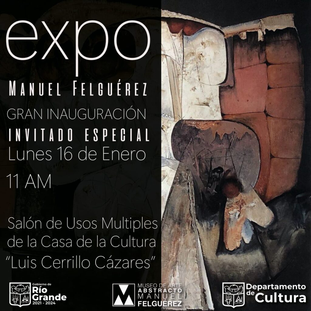 RÍO GRANDE, ZAC.- Con el fin de promover la cultura entre las y los ciudadanos, se ha dado a conocer la exposición de 30 obras del reconocido artista zacatecano Manuel Felguérez, misma que estará exhibida a partir del lunes 16 de enero hasta el lunes 30 de enero en la Casa de Cultura, así lo dio a conocer Aurelia Rivas Sánchez, directora de Cultura en el municipio.
