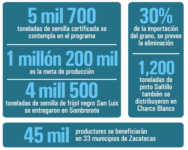 En Sombrerete, se entregaron 4 mil 500 toneladas de frijol negro San Luis y mil 200 de pinto Saltillo, en beneficio de 45 mil pequeños productores en 33 municipios zacatecanos para sembrar 230 mil hectáreas.