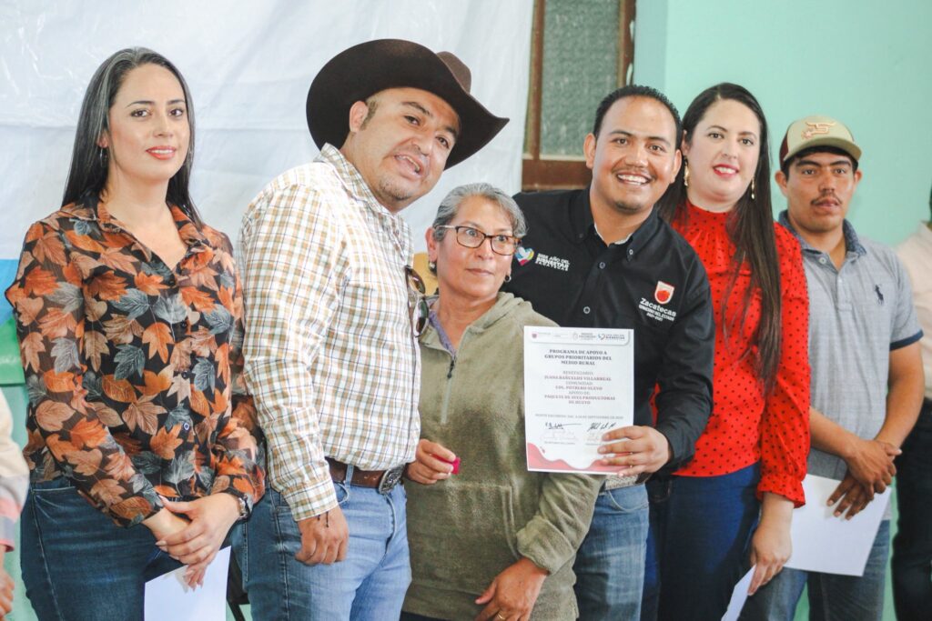 MONTE ESCOBEDO, ZAC.– El gobierno municipal realizó la entrega de 87 paquetes de aves productoras de huevo y 5 bultos de nopal, beneficiando a un total de 92 familias monteescobedenses.