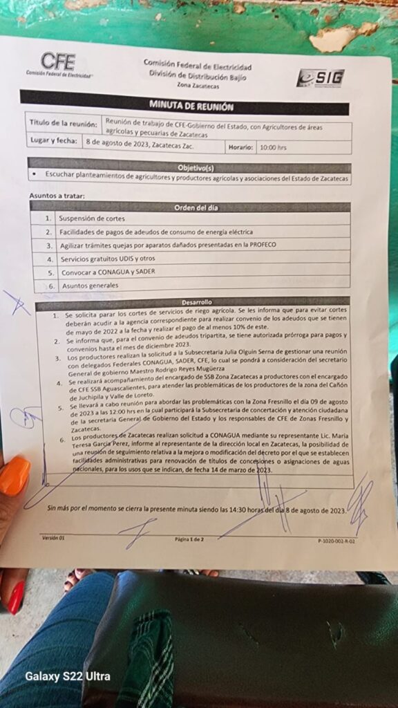 Finalmente, durante la reunión en la que participaron representantes de la CFE, el Gobierno estatal y los agricultores, se firmó una minuta en la cual llegaron a varios acuerdos, entre ellos, que para evitar futuros cortes de energía, se deberán abonar los adeudos acumulados desde mayo de 2022 hasta la fecha, pagando al menos el 10% de este monto.