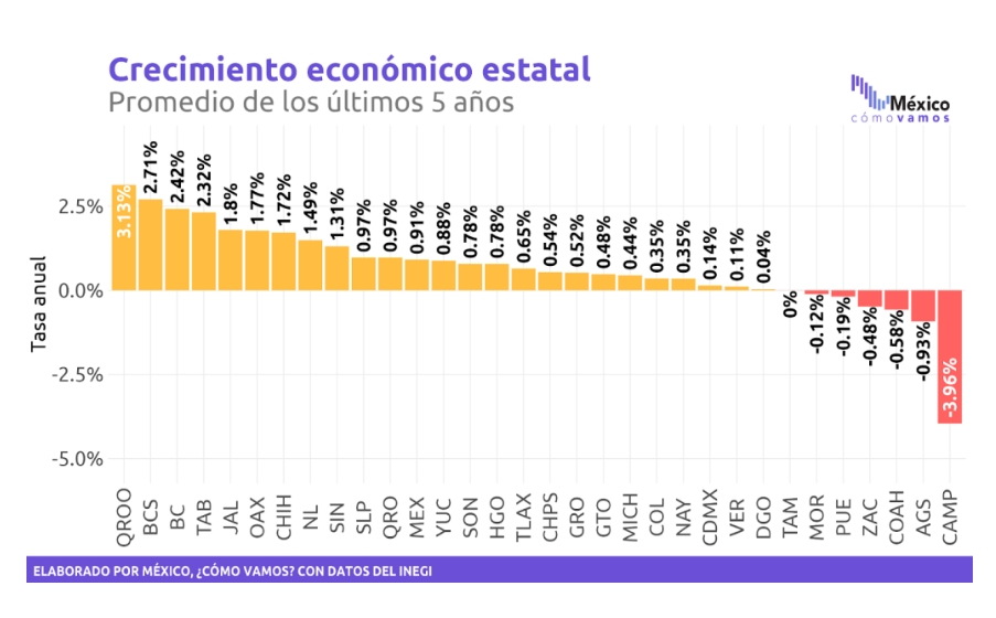Al observar el crecimiento estatal promedio en los últimos cinco años, Quintana Roo se sitúa como el estado con mayor crecimiento, con 3.13%, mientras que Campeche ha mostrado la mayor caída, promediando (-)3.96% en dicho periodo.