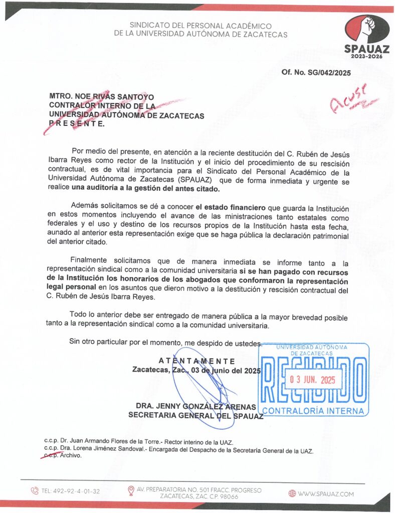 ZACATECAS, ZAC.- El Sindicato de Personal Académico de la Universidad Autónoma de Zacatecas (SPAUAZ) exigió a la Contraloría Interna de la UAZ que se realice una auditoría a la gestión de Rubén Ibarra Reyes al frente de la UAZ.