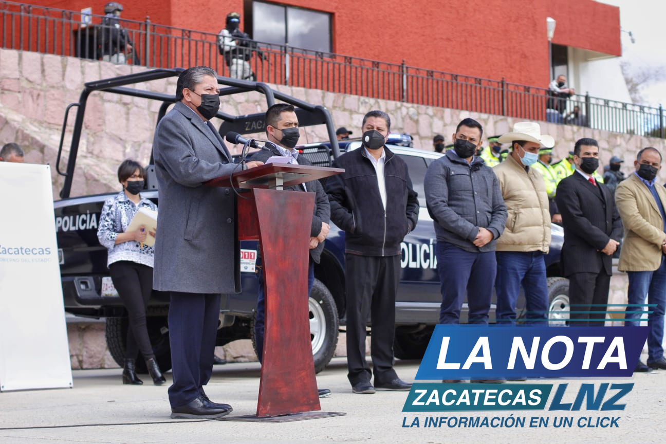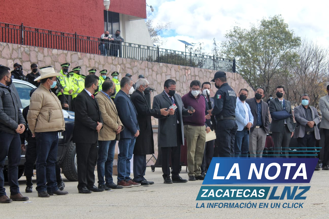 «Hoy recibirán carro con radio patrulla el municipio de Jerez, Villa Hidalgo, Ojocaliente, Panuco, Vetagrande… Carro patrulla para la Secretaría de Seguridad Pública, la Policía Estatal Preventiva, la Metrópol y recibirán motocicletas patrulla la de Fresnillo, la de Zacatecas, Ojocaliente y Loreto…», Señaló el mandatario.