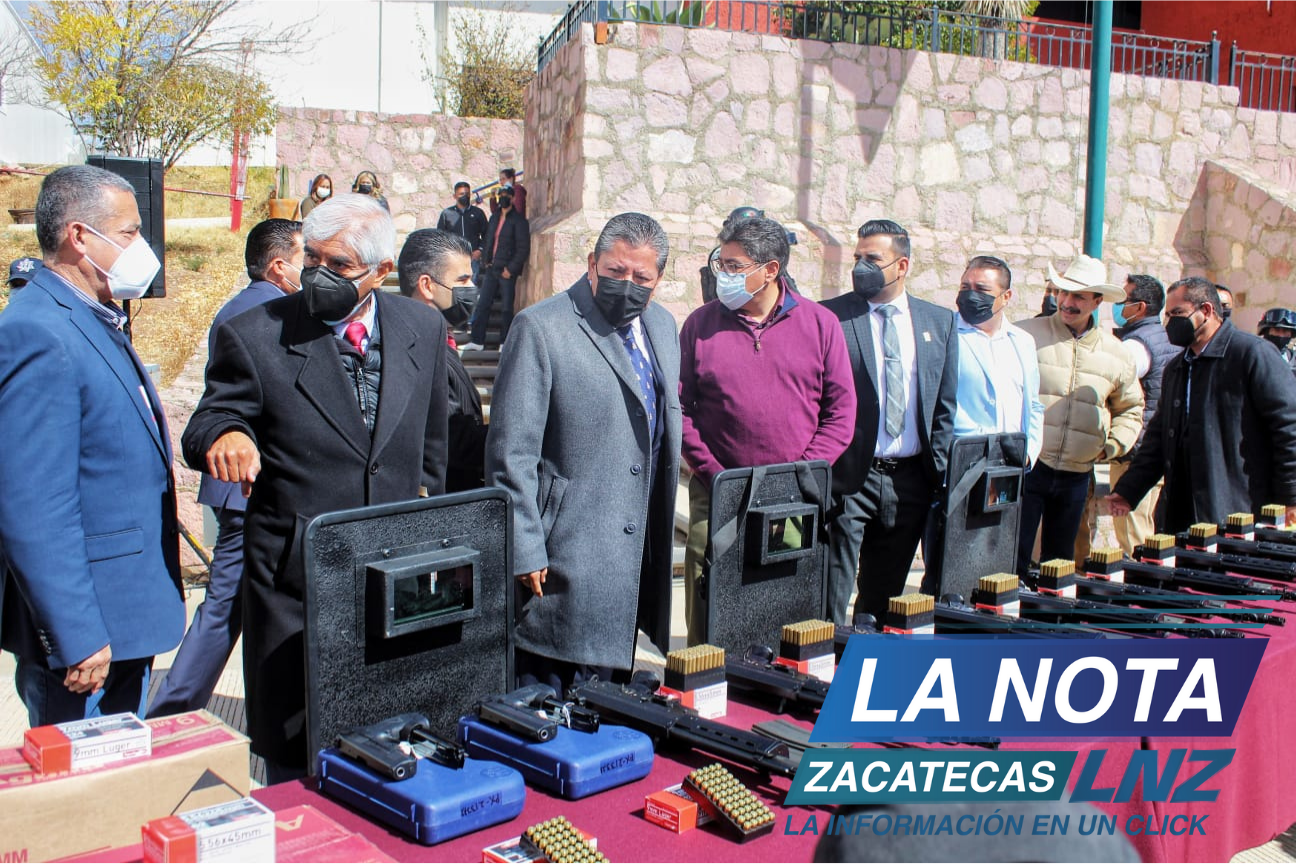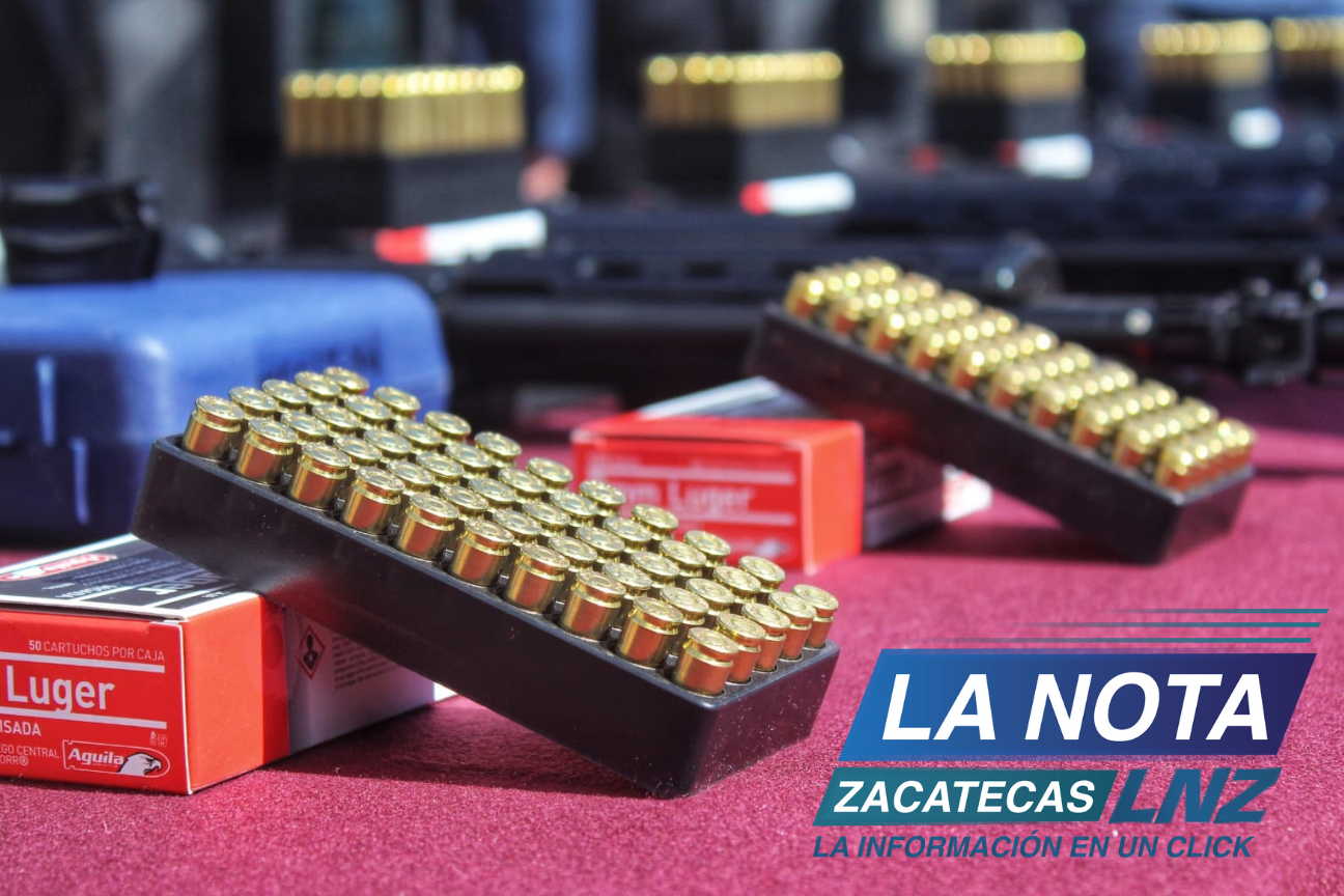 En relación a las armas de fuego «van a recibir el municipio de vetagrande, Jerez, Ojocaliente, Genaro, Fresnillo y el municipio de Zacatecas… cartuchos para armas de fuego calibre 9 mm va a recibir el municipio de Luis Moya, Vetagrande, Morelos, Pánuco, Jerez, Ojocaliente, Genaro Codina, Trancoso, Enrique Estrada, Juan Aldama, Villa García, Villa Hidalgo, Ciudad Cuauhtémoc, Cañitas de Felipe Pescador, Loreto, Pánfilo Natera», comentó.