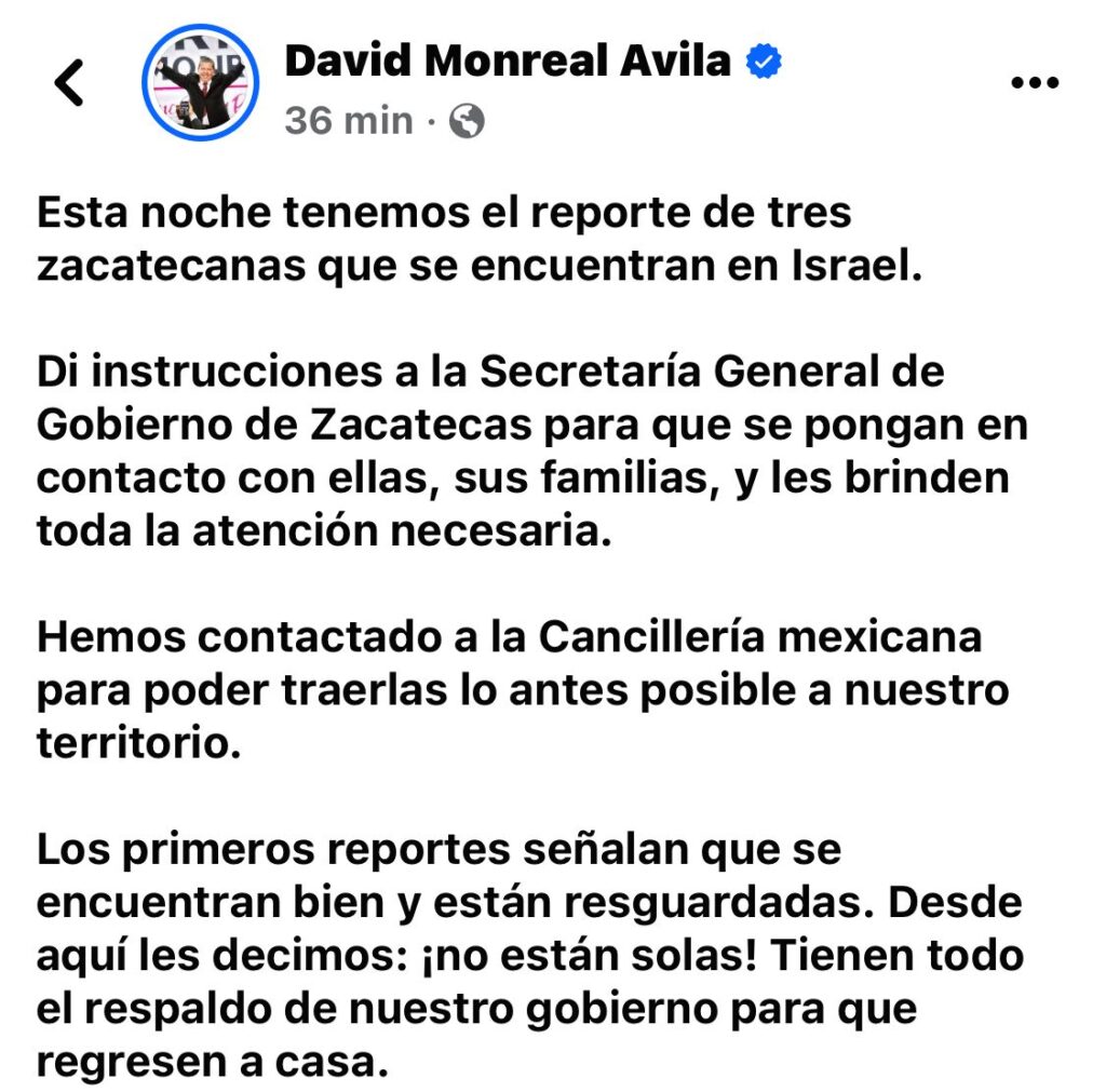 ZACATECAS, ZAC.- Tres zacatecanas se encuentran en Israel, confirmó el gobernador David Monreal Ávila.
