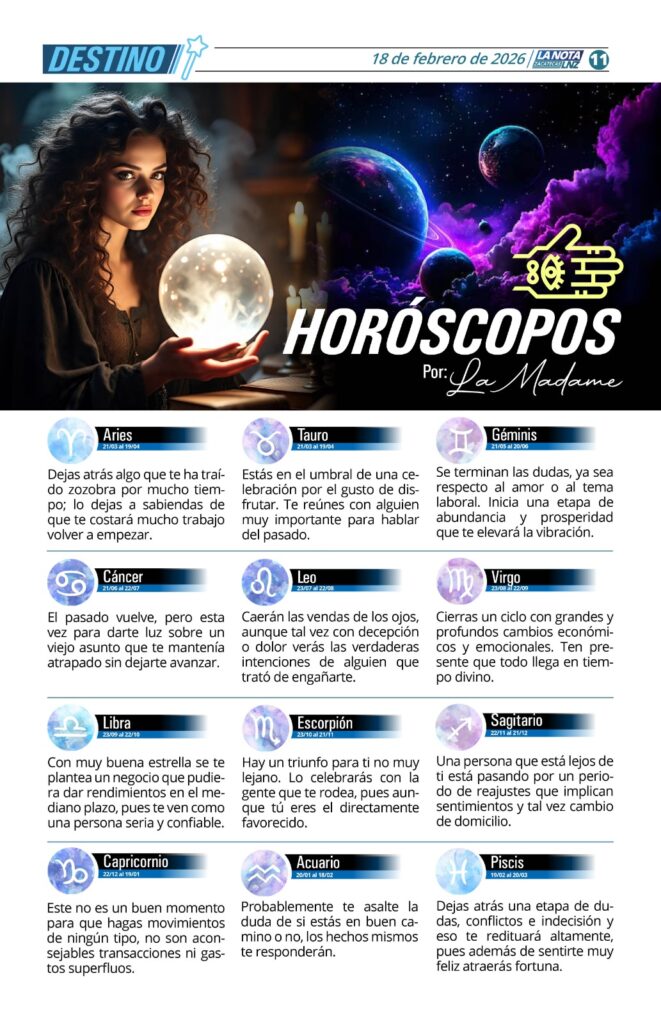 Destino Horóscopos de la Madame Feb-18-2026 ¿Viajarás? ¿Encontrará ese trabajo que deseas? ¿Se te declarará? ¿Irás de fiesta? Descubre lo que te depara el destino con los Horóscopos de la Madame. 🔮✨