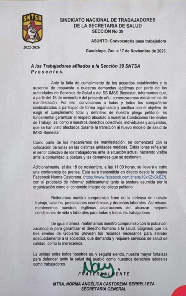 GUADALUPE, ZAC.- El Sindicato Nacional de Trabajadores de la Secretaría de Salud (Sntsa), Sección No. 39, anunció mediante un comunicado de prensa que este martes 18 de noviembre de 2025, realizarán “mecanismos de manifestación” ante la «falta de cumplimiento de los acuerdos establecidos y la ausencia de respuesta» a sus demandas legítimas por parte de las autoridades de Servicios de Salud y del IMSS Bienestar.