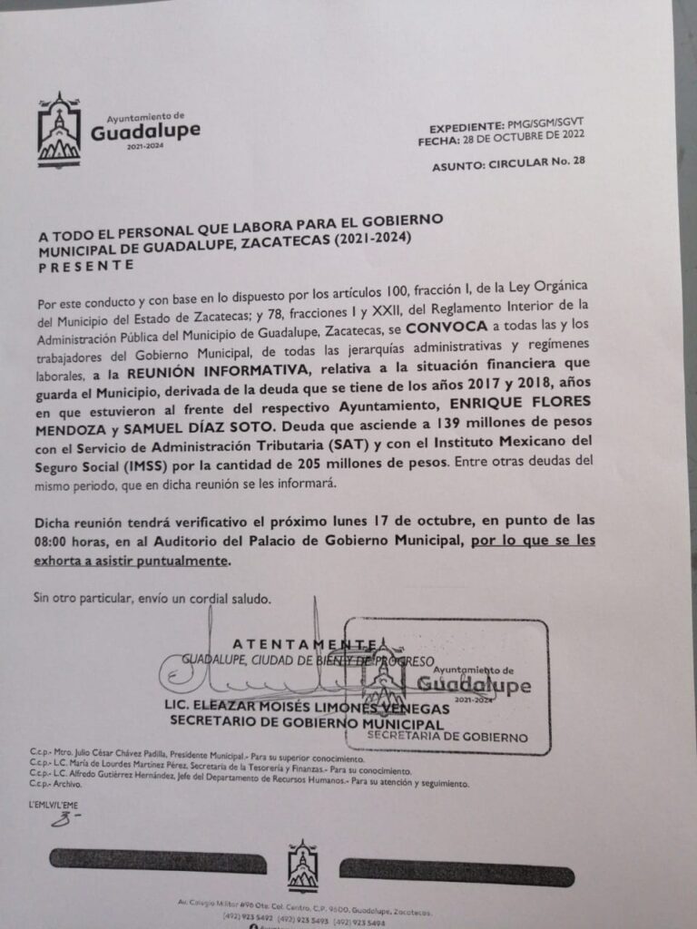 El sábado en redes sociales circuló un escrito en el que una afectada expone la incertidumbre que impera entre los empleados municipales “…con respecto al presidente (Julio César Chávez, de Morena) y su equipo la cual (sic) nos está pidiendo que firmemos un documento que según eso para demandar a Enrique Guadalupe y quien no firme el documento nos amenazan con detenernos el pago quincenal”.