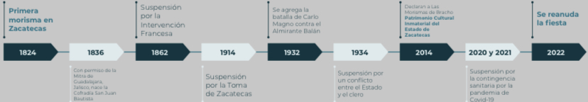 De acuerdo con Felipe Escobar Galicia, “morismero” desde hace 53 años, cronista y fotógrafo de la fiesta y profesor jubilado, las morismas se celebran en Zacatecas desde 1824, cuando se fundó la primera Hermandad con 14 mineros que venían de Tlaxcala a trabajar a las minas zacatecanas.