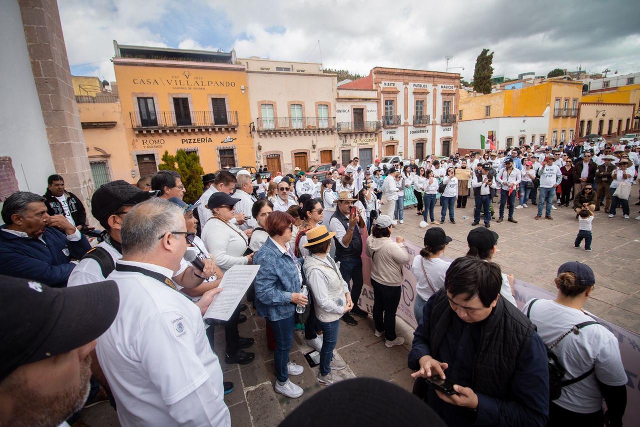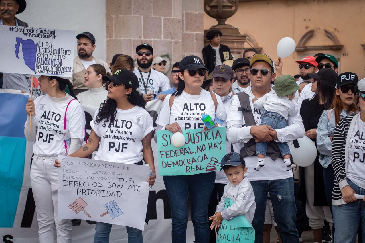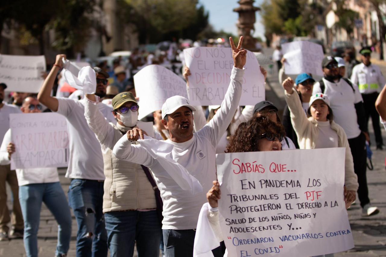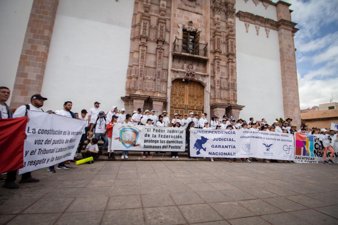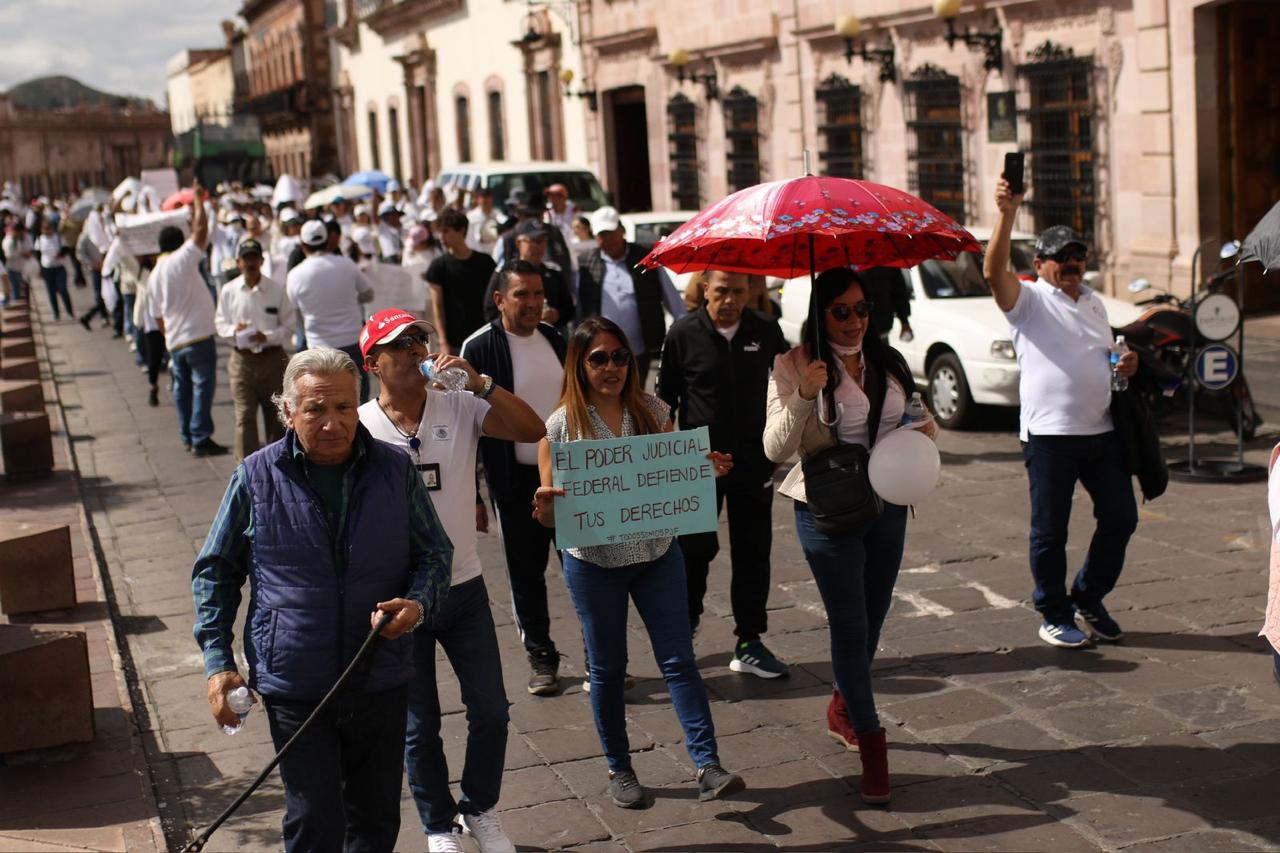 ZACATECAS, ZAC.- La mañana de este domingo, trabajadores del Poder Judicial de la Federación, sus familiares, así como diversas asociaciones y simpatizantes, se manifestaron en las principales calles del Centro Histórico como respuesta a la extinción de los 13 fideicomisos del PJF.
