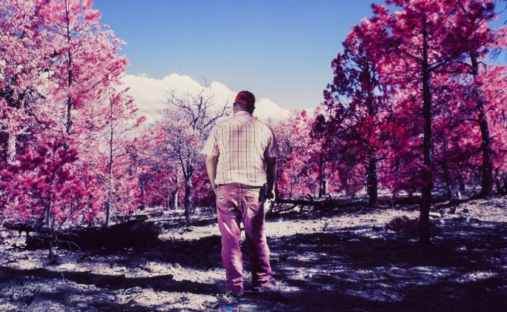 La fotografía infrarroja es sensible al espectro infrarrojo de la luz, la mayoría de las cámaras tienen un filtro que bloquea este espectro. No siempre se refleja, pero donde sí es posible verlo es en donde hay clorofila, es decir, que las plantas y árboles es donde se aplicará el tono rosado del infrarrojo, explica Aragón. Además de dar fuerza a la imagen con estos colores, la fotógrafa señala que el color rosa contrasta con el matiz de la masculinidad que tiene su trabajo.
