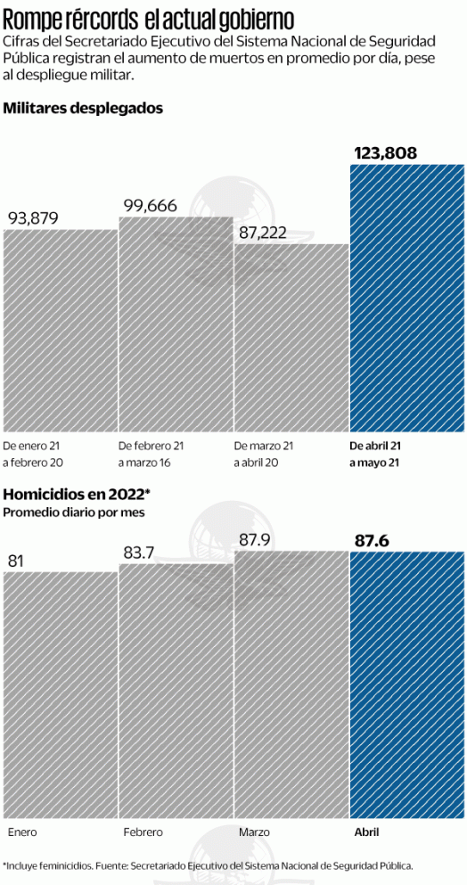 Sin embargo, de acuerdo con cifras del Secretariado Ejecutivo del Sistema Nacional de Seguridad Pública, enero tuvo en promedio 81 homicidios y feminicidios por día; febrero, 83.7; marzo, 87.9 y abril con 87.6.