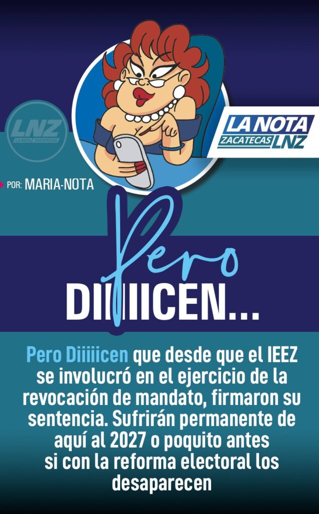 Por cierto, con la escasez de recursos me diiiiicen quienes andan batallando son las, los y les consejeros del IEEZ. Ya por todos lados les dijeron que no hay dinero ni para la nómina. Que vayan buscando fiado hasta su mandado, porque no les depositarán por lo pronto un sólo peso.
