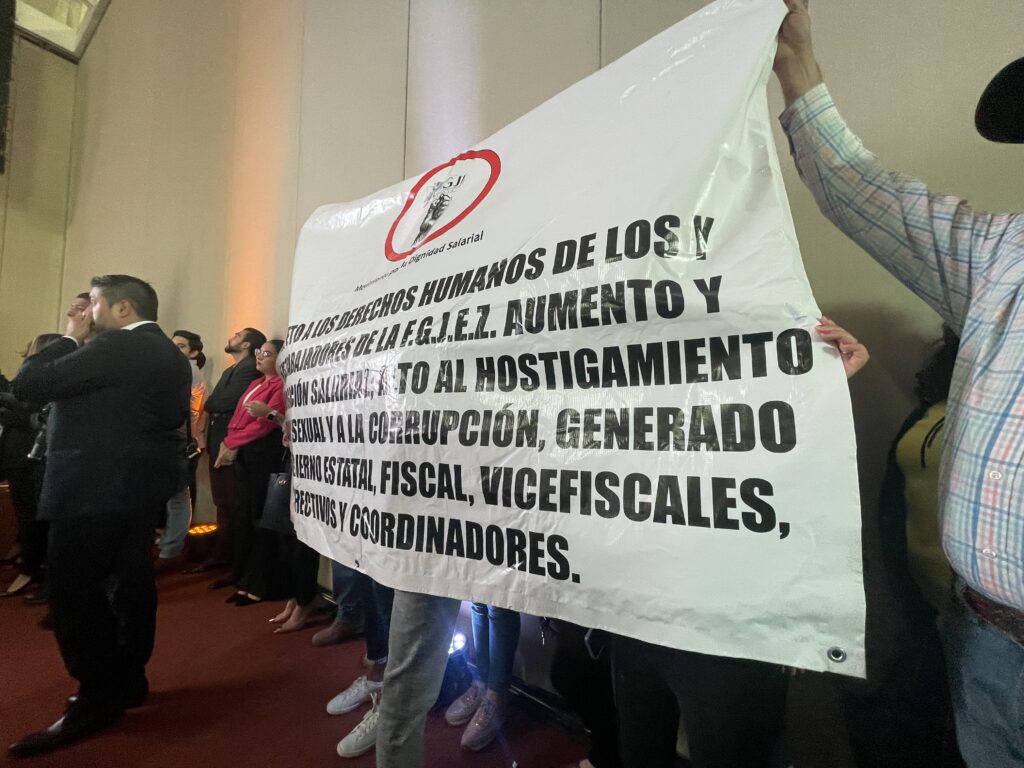 ZACATECAS, ZAC.- Este jueves fue entregado el Premio Estatal de la Juventud y al evento arribaron trabajadores de la Fiscalía General de Justicia del Estado de Zacatecas (FGJEZ), quienes se mantienen en plantón debido a que no se les ha resuelto la petición de tener un aumento salarial.