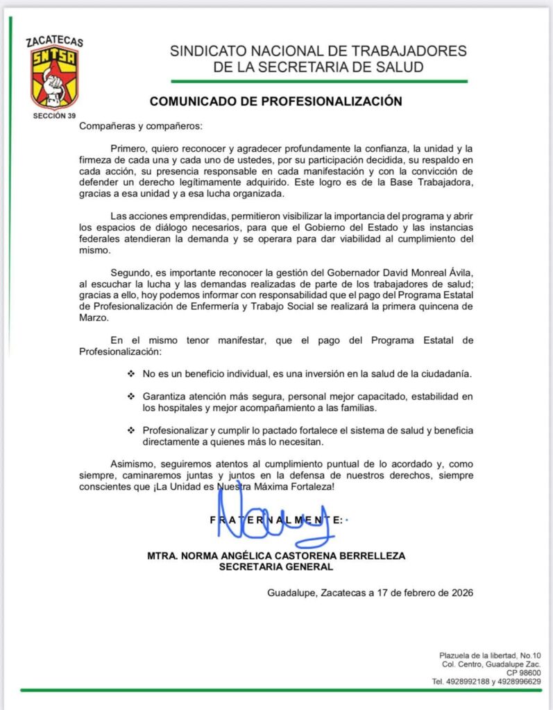 GUADALUPE, ZAC.- La unidad de los trabajadores de la salud rindió frutos. Este 17 de febrero, el Sindicato Nacional de Trabajadores de la Secretaría de Salud (SNTSA), Sección 39, anunció que se ha garantizado el pago del Programa Estatal de Profesionalización de Enfermería y Trabajo Social, el cual se hará efectivo durante la primera quincena de marzo.