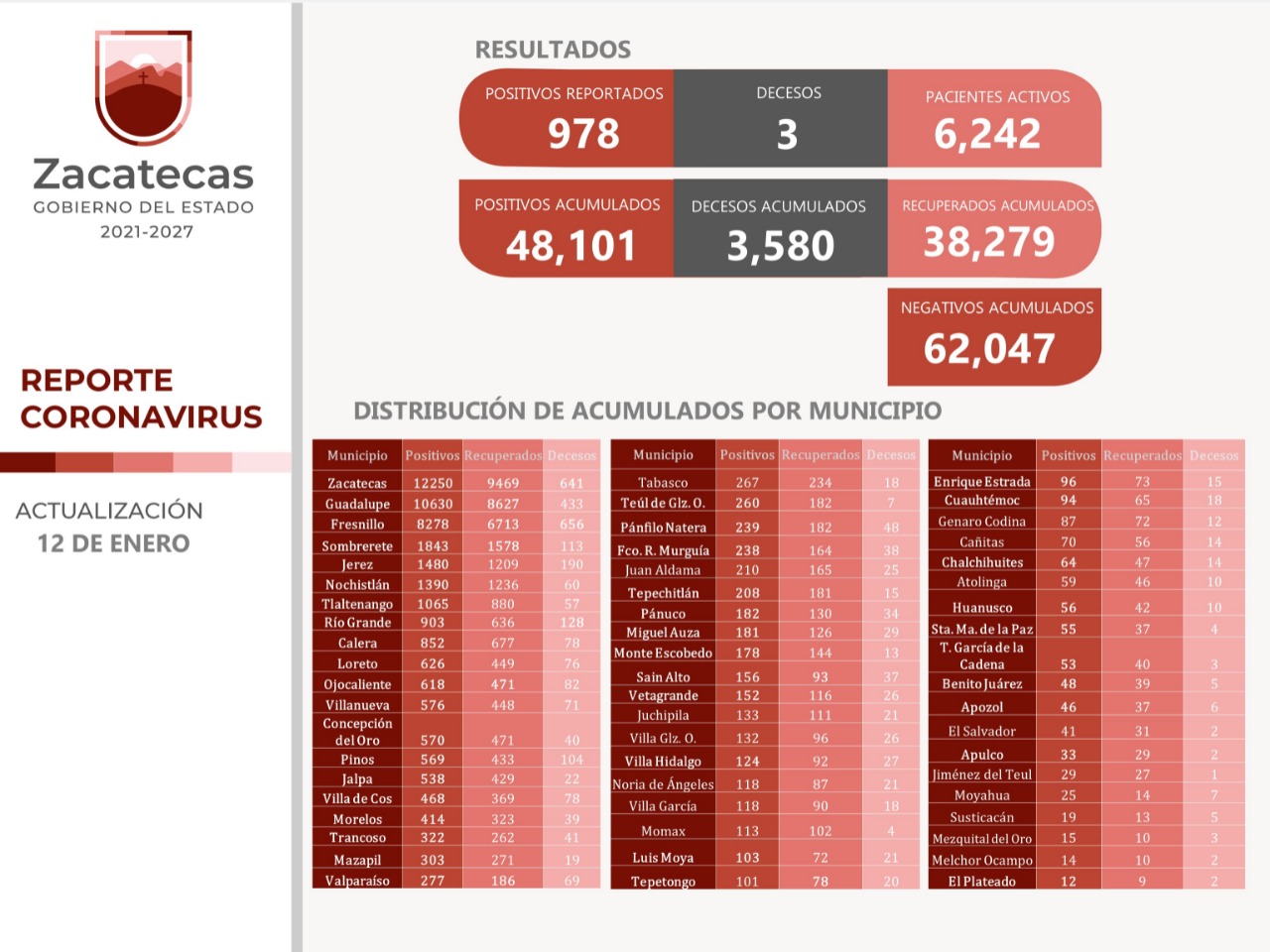 El municipio Zacatecas registró 366 casos positivos; Guadalupe, 220; Fresnillo, 119; Teúl de González Ortega, 34: Calera, 30; Nochistlán, 27; Jerez, 23; Ojocaliente, 16; Sombrerete, 15; Loreto, 12; Morelos, 11 y Jalpa, 10.