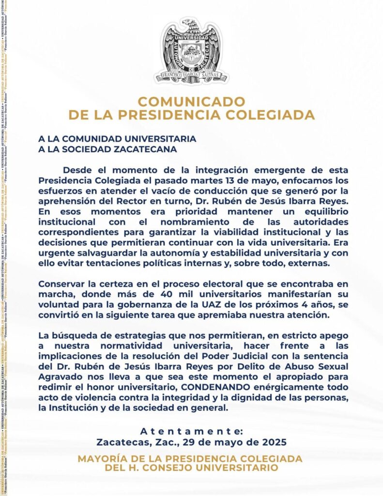 Finalizan diciendo que “en estricto apego a la normatividad universitaria, hacer frente a las implicaciones de la resolución del Poder Judicial con la sentencia del Dr. Rubén de Jesús Ibarra Reyes por Delito de Abuso Sexual Agravado nos lleva a que sea este momento el apropiado para redimir el honor universitario, CONDENANDO enérgicamente todo acto de violencia contra la integridad y la dignidad de las personas, la Institución y de la sociedad en general”.