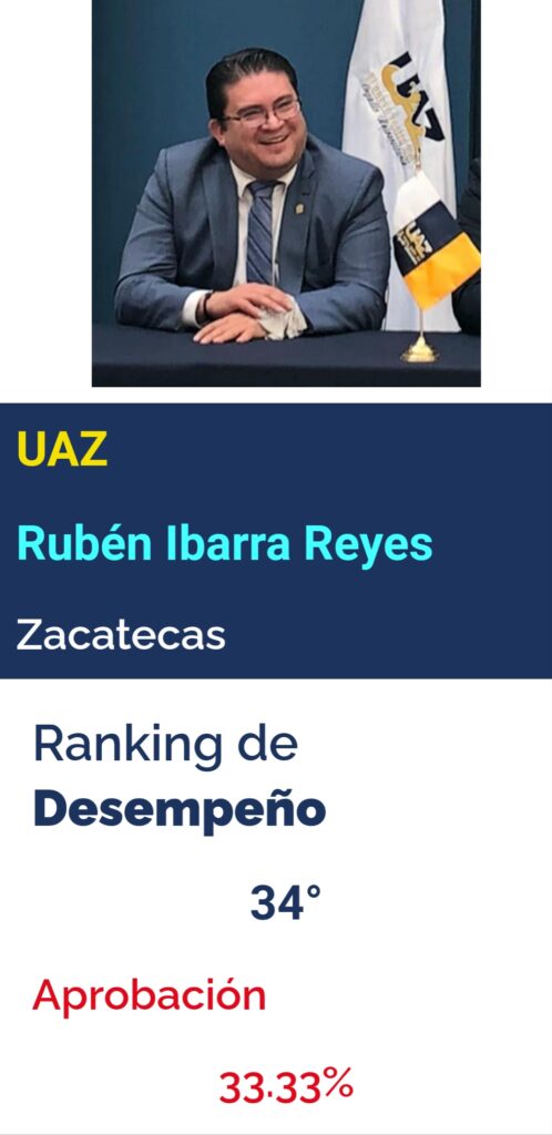 ZACATECAS, ZAC.- Rubén Ibarra Reyes, rector de la Universidad Autónoma de Zacatecas, ocupó la posición 34 de 35 universidades evaluadas en el ranking de desempeño.