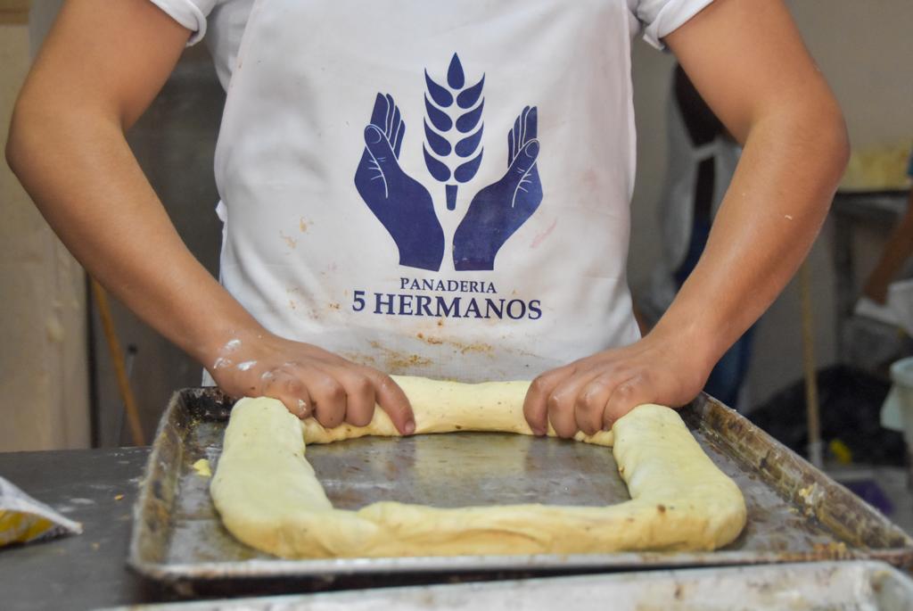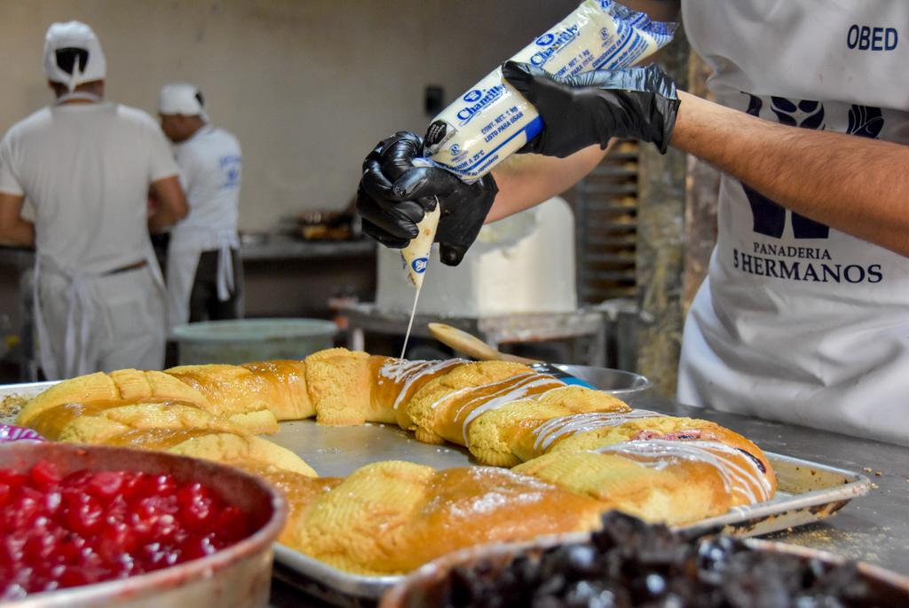 ZACATECAS, ZAC.- Con emoción, amor y mucha pasión por su trabajo, los panaderos de la panadería 5 Hermanos realizan la tradicional rosca de reyes.