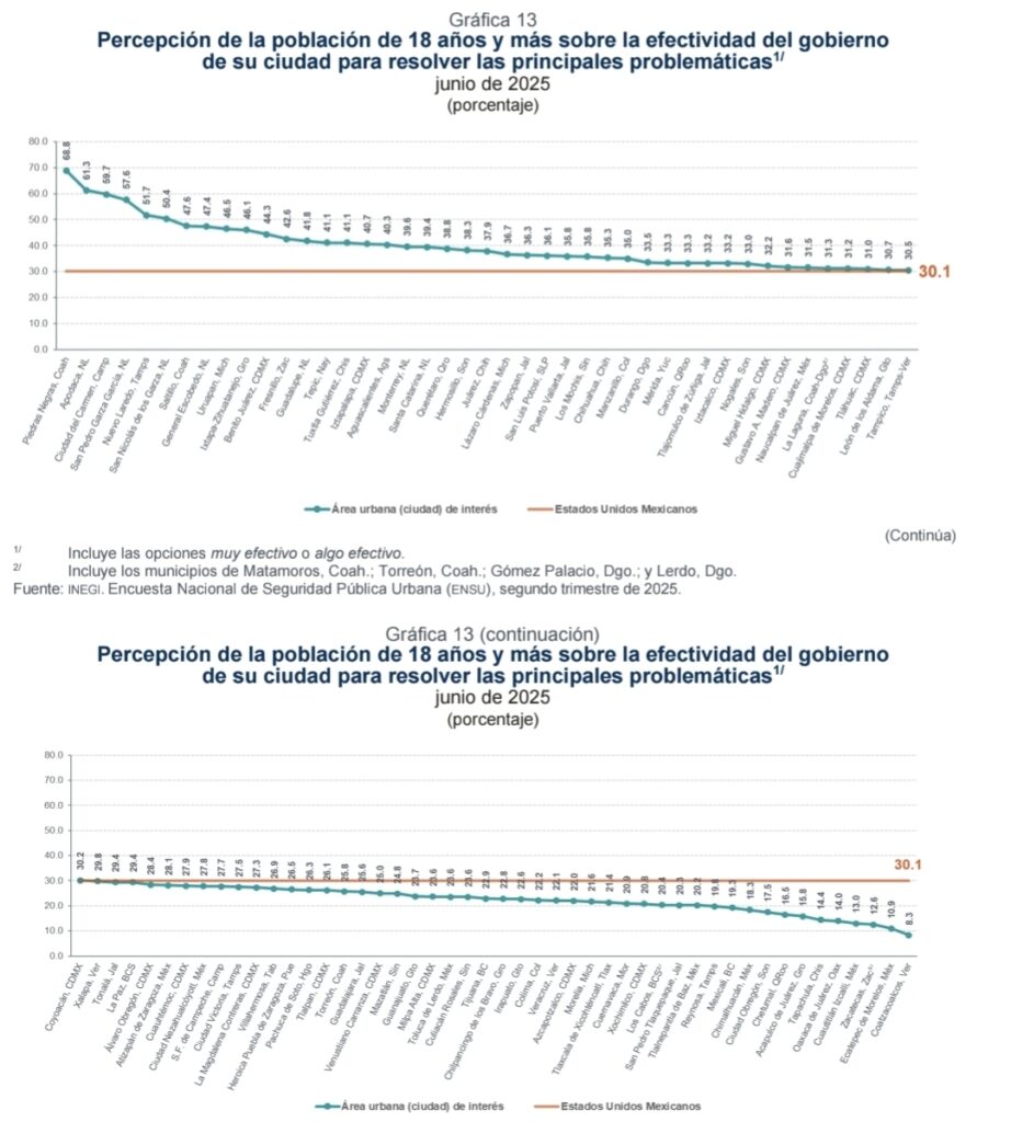 En tanto que en la percepción sobre la efectividad del gobierno de su ciudad para resolver las principales problemáticas, en Zacatecas sólo el 12.6% de la población confía en su gobierno; en Fresnillo es el 42.6 por ciento.